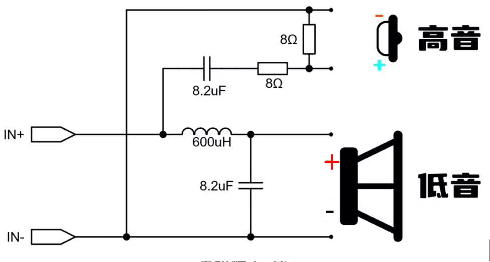 最后于B站 UP主大佬 摇滚陈 改装二分频的图纸( 原截图里低音正负写反了 下面的图我改正了)