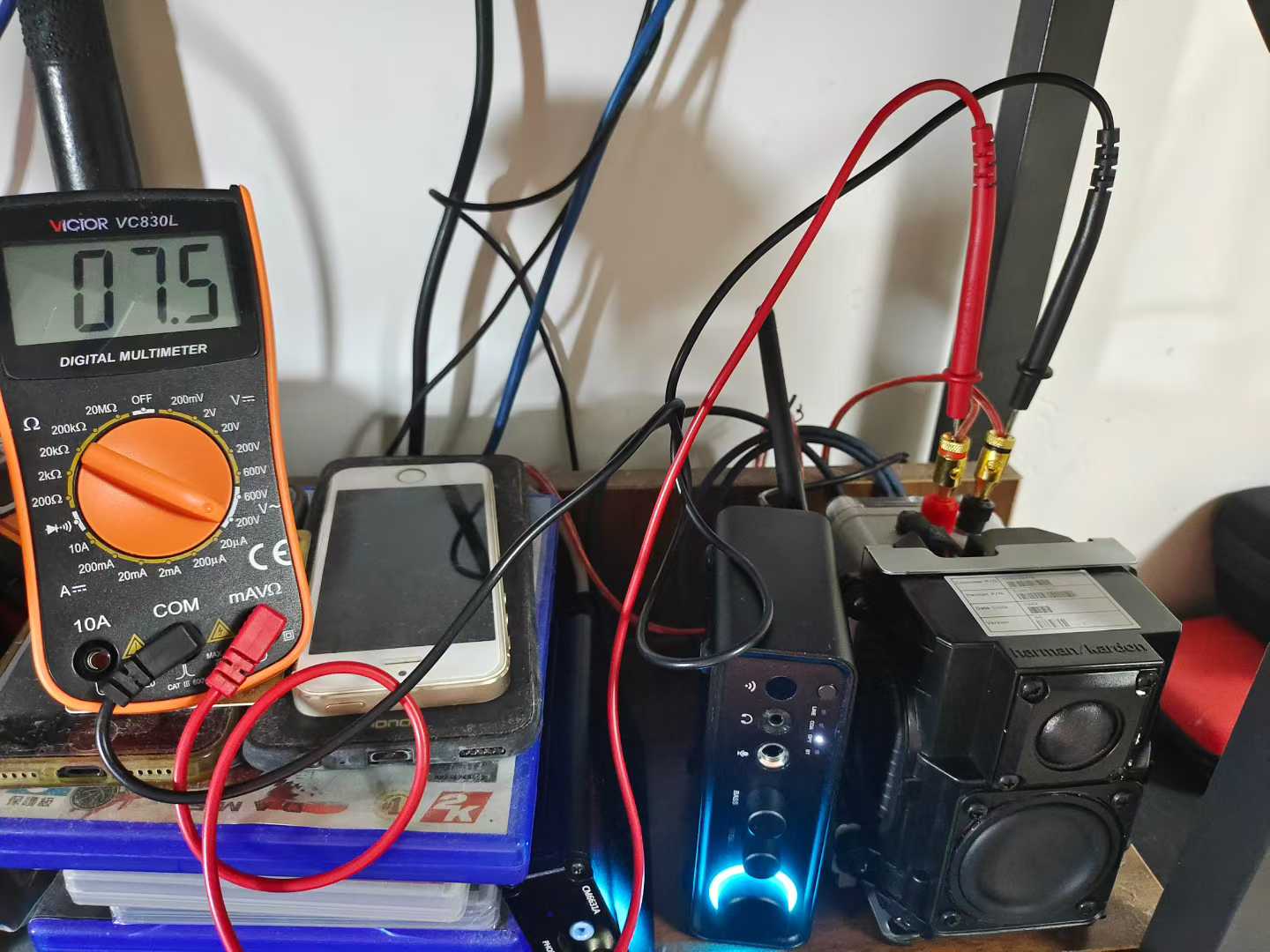因为原我用的功放机是 双100W输出 怕是把喇叭烧了,换了个12V电源上去测量实时峰值电压7.5V (平均我自己习惯的音量更是在 2-3V左右) 功率完全没问题